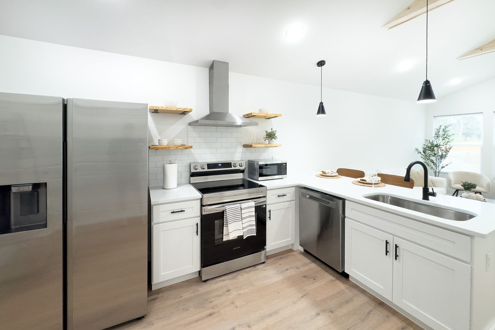 Sleek quartz countertops and stainless steel appliances - including a refrigerator, glass-top stove, microwave, and dishwasher